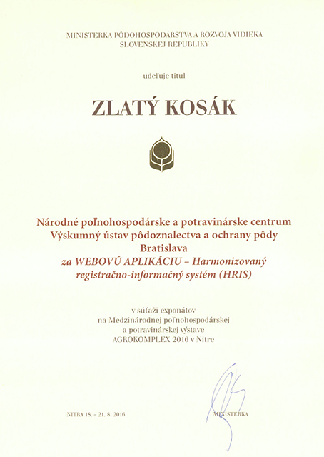 Na tohtoročnej 43. medzinárodnej poľnohospodárskej a potravinárskej výstave Agrokomplex 2016, konanej v dňoch 18. – 21. augusta 2016, získal NPPC – Výskumný ústav pôdoznalectva a ochrany pôdy ocenenie Zlatý kosák za webovú aplikáciu Harmonizovaný registračno-informačný systém (HRIS), ktorá bola vytvorená pre aplikáciu dusičnanovej smernice o ochrane vodných zdrojov pred dusičnanmi z poľnohospodárstva. Umožňuje užívateľom poľnohospodárskej pôdy žiadať o výnimku aplikácie dusíkatých hnojív v zakázanom období v zmysle zákona č. 394/2015, ktorým sa mení a dopĺňa zákon č. 136/20000 Z.z. Registrácia a používanie aplikácie sú bezplatné.